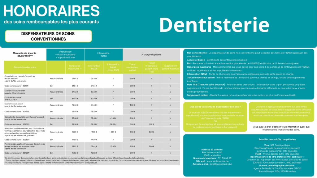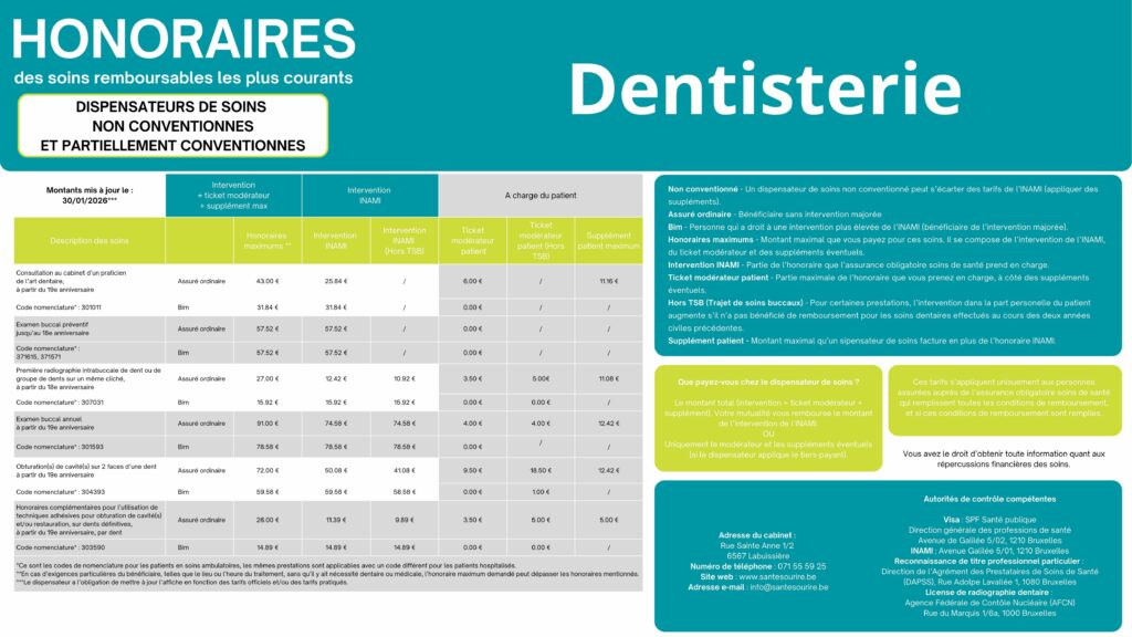 Un dentiste non conventionné ou partiellement conventionné peut appliquer un supplément dans certains cas. Ce supplément est normalement intégré à l’intervention personnelle du patient.